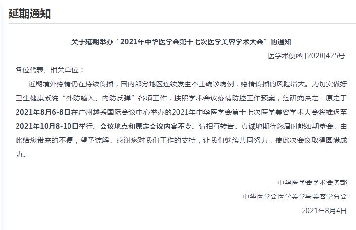 近期境外疫情仍在持續(xù)傳播,國(guó)內(nèi)部分地區(qū)連續(xù)發(fā)生本土確診病例,疫情傳播的風(fēng)險(xiǎn)增大。為切實(shí)做好衛(wèi)生健康系統(tǒng)“外防輸入、內(nèi)防反彈”各項(xiàng)工作,按照學(xué)術(shù)會(huì)議疫情防控工作預(yù)案,經(jīng)研究決定:原定于2021年8月6-8日在廣州越秀國(guó)際會(huì)議中心舉辦的2021年中華醫(yī)學(xué)會(huì)第十七次醫(yī)學(xué)美容學(xué)術(shù)大會(huì)將推遲至2021年10月8-10日舉行。會(huì)議地點(diǎn)和原定會(huì)議內(nèi)容不變。請(qǐng)相互轉(zhuǎn)告。真誠(chéng)地期待您屆時(shí)能如期參會(huì)。由此給您帶來(lái)的不便,望予諒解。感謝您對(duì)我們工作的支持,讓我們繼續(xù)共同努力,使此次會(huì)議取得圓滿成功。
