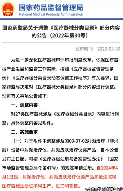 3月30日,國家藥監(jiān)局發(fā)布“關(guān)于調(diào)整《醫(yī)療器械分類目錄》部分內(nèi)容的公告”(全文鏈接 → t.ly/kRDQ),公告顯示,自2024年4月1日起,射頻治療儀、射頻皮膚治療儀類產(chǎn)品未依法取得醫(yī)療器械注冊證不得生產(chǎn)、進(jìn)口和銷售。