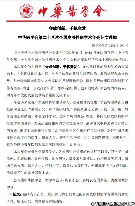 中華醫(yī)學會皮膚性病學分會定于2022年6月16-19日在沈陽召開“中華醫(yī)學會第二十八次全國皮膚性病學術年會”,會議將采取線下和線上相結(jié)合的形式。