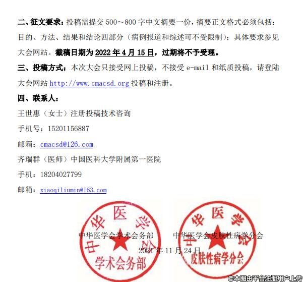 年會歷來重視廣大醫(yī)師積極主動參與,重視稿件的征集。學會將繼續(xù)在自由投稿中遴選出“基礎研究”和“臨床研究”的高質(zhì)量論文各10篇,給予免下屆年會注冊費鼓勵。年會堅持學術開放和爭鳴的辦會理念,特向全國皮膚科醫(yī)師征集學術演講者。為保證完成相關的學術交流內(nèi)容,演講者采取特邀和自薦結(jié)合的方式,邀請全國皮膚科專家主動申請參與各個相應欄目的交流,歡迎全國從事皮膚性病工作的醫(yī)生、研究人員、研究生和護師(士)等踴躍投稿并積極參會,特別鼓勵中青年醫(yī)師和基層醫(yī)院醫(yī)師的主動參與。