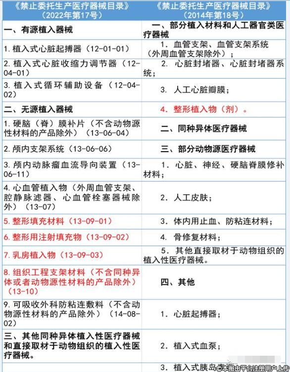 與2014年的版本相比,新修訂的《目錄》去除了生產(chǎn)工藝已較為成熟的產(chǎn)品,如腔靜脈濾器、心血管栓塞器械、植入式胰島素泵;新增及細(xì)化了近年來出現(xiàn)較多可疑不良事件的醫(yī)美植入材料:整形填充材料、整形用注射填充物、乳房植入物、組織工程支架材料。