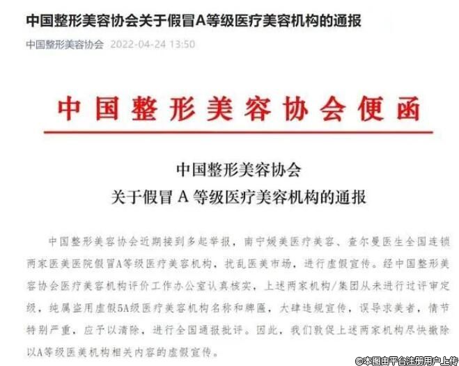 2022年4月24日,中國(guó)整形美容協(xié)會(huì)發(fā)布消息,南寧媛美醫(yī)療美容、查爾曼醫(yī)生全國(guó)連鎖兩家醫(yī)美醫(yī)院假冒A等級(jí)醫(yī)療美容機(jī)構(gòu),擾亂醫(yī)美市場(chǎng),進(jìn)行虛假宣傳。經(jīng)中國(guó)整形美容協(xié)會(huì)醫(yī)療美容機(jī)構(gòu)評(píng)價(jià)工作辦公室認(rèn)真核實(shí),上述兩家機(jī)構(gòu)/集團(tuán)從未進(jìn)行過(guò)評(píng)審定級(jí),純屬盜用虛假5A級(jí)醫(yī)療美容機(jī)構(gòu)名稱和牌匾,大肆違規(guī)宣傳,誤導(dǎo)求美者,情節(jié)特別嚴(yán)重,應(yīng)予以清除,進(jìn)行全國(guó)通報(bào)批評(píng)。