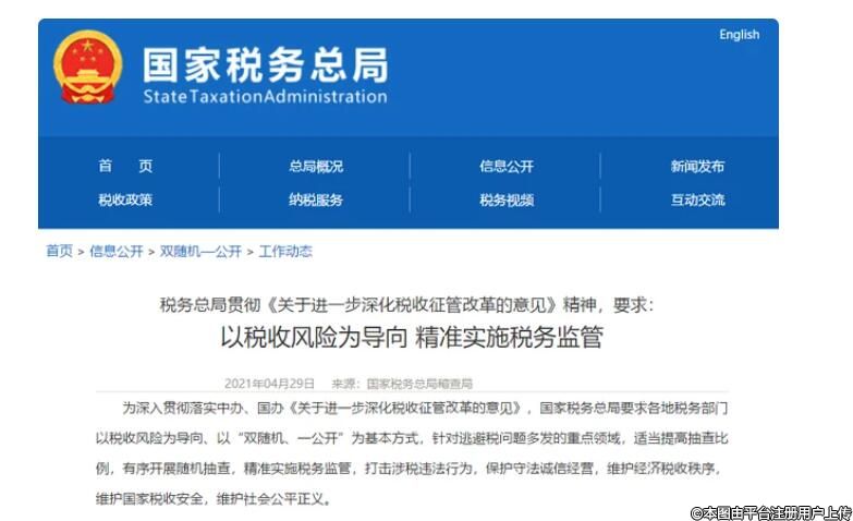 據(jù)了解,早在2021年4月29日,國(guó)家稅務(wù)總局官網(wǎng)發(fā)布《稅務(wù)總局貫徹精神,要求以稅收風(fēng)險(xiǎn)為導(dǎo)向 精準(zhǔn)實(shí)施稅務(wù)監(jiān)管》,要求各地稅務(wù)部門(mén)針對(duì)逃避稅問(wèn)題多發(fā)的重點(diǎn)領(lǐng)域,適當(dāng)提高抽查比例,有序開(kāi)展隨機(jī)抽查,精準(zhǔn)實(shí)施稅務(wù)監(jiān)管,打擊涉稅違法行為。