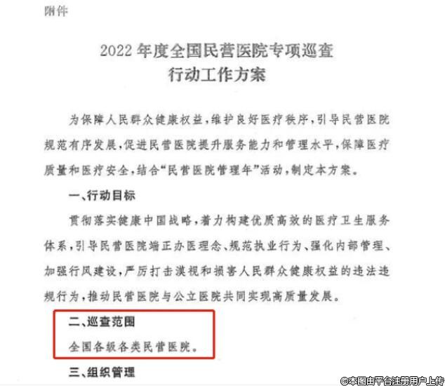 從多個渠道獲悉的文件來看,國家衛(wèi)健委發(fā)文時提到的巡查范圍為“全國各級各類民營醫(yī)院”,但又補充提到“要實現(xiàn)轄區(qū)內(nèi)二級以上民營醫(yī)院和50張床位以上民營醫(yī)院全覆蓋”。