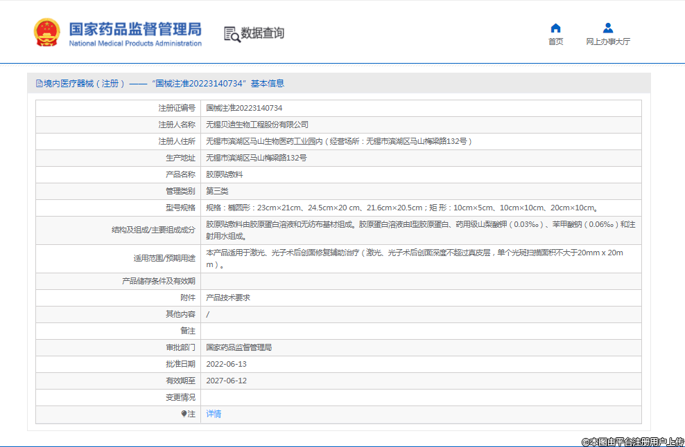 2022年6月13日,無錫貝迪生物工程股份有限公司(以下簡稱“貝迪生物”)申報的“膠原貼敷料”正式獲得國家藥監(jiān)局批準(zhǔn),注冊證號:國械注準(zhǔn)20223140734。