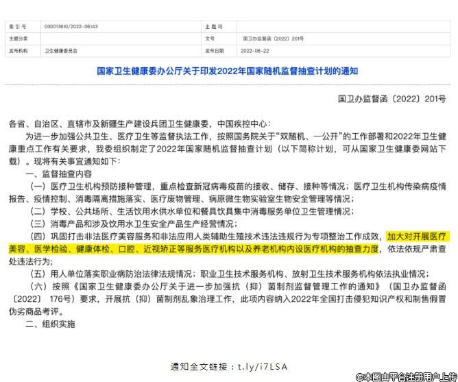 6月22日,國家衛(wèi)生健康委辦公廳印發(fā)2022年國家隨機監(jiān)督抽查計劃,監(jiān)督抽查內(nèi)容包括:醫(yī)療衛(wèi)生機構(gòu)預(yù)防接種管理,重點檢查新冠病毒疫苗的接收、儲存、接種等情況;醫(yī)療衛(wèi)生機構(gòu)傳染病疫情報告、疫情控制、消毒隔離措施落實、醫(yī)療廢物管理、病原微生物實驗室生物安全管理等情況;鞏固打擊非法醫(yī)療美容服務(wù)和非法應(yīng)用人類輔助生殖技術(shù)違法違規(guī)行為專項整治工作成效,加大對開展醫(yī)療美容、醫(yī)學(xué)檢驗、健康體檢、口腔、近視矯正等服務(wù)醫(yī)療機構(gòu)以及養(yǎng)老機構(gòu)內(nèi)設(shè)醫(yī)療機構(gòu)的抽查力度,依法依規(guī)嚴(yán)肅查處違法行為。