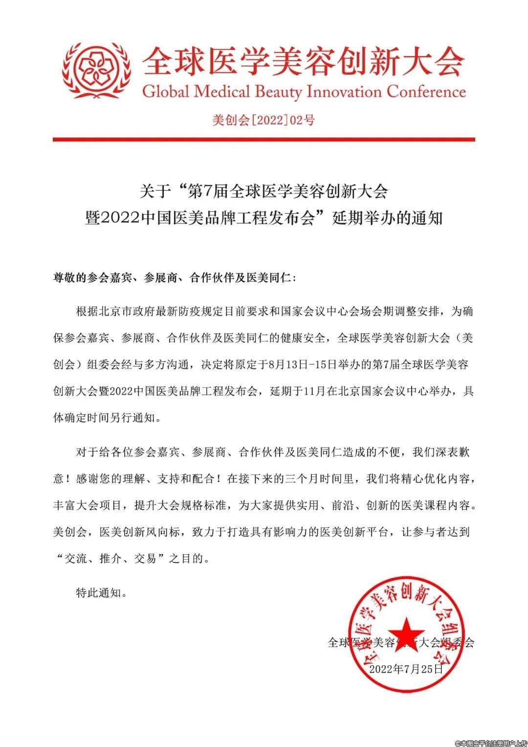 延期通知 第七屆全球醫(yī)學(xué)美容創(chuàng)新大會暨2022中國醫(yī)美品牌工程發(fā)布會