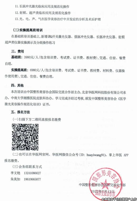本次培訓(xùn)由中國(guó)整形美容協(xié)會(huì)國(guó)際交流合作部主辦,北京華醫(yī)網(wǎng)科技股份有限公司承辦,中南大學(xué)湘雅醫(yī)院皮膚科協(xié)辦。學(xué)習(xí)完成并經(jīng)過考核,頒發(fā)中國(guó)整形美容協(xié)會(huì)《醫(yī)學(xué)激光美容操作規(guī)范化培訓(xùn)》證書。