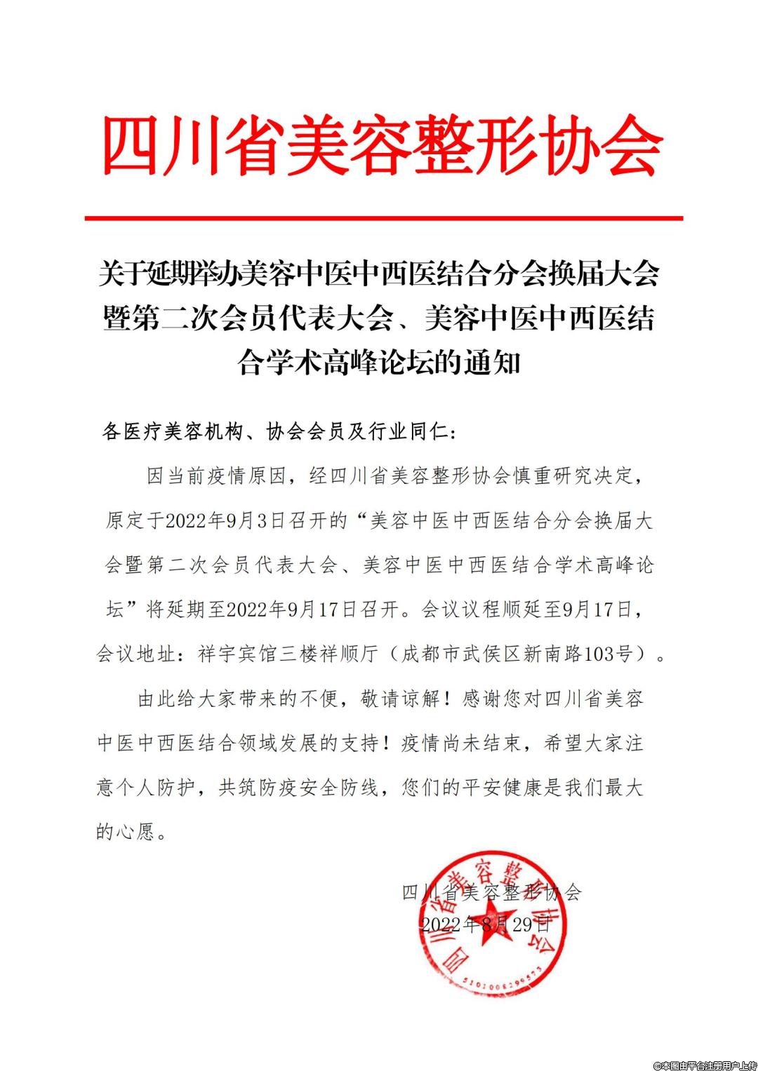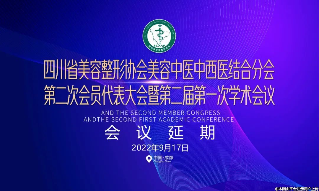 因當(dāng)前疫情原因,經(jīng)四川省美容整形協(xié)會(huì)慎重研究決定,原定于2022年9月3日召開的“美容中醫(yī)西醫(yī)結(jié)合分會(huì)換屆大會(huì)暨第二次會(huì)員代表大會(huì)、美容中醫(yī)西醫(yī)結(jié)合學(xué)術(shù)高峰論壇”將延期至2022年9月17日召開。