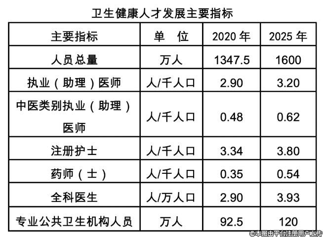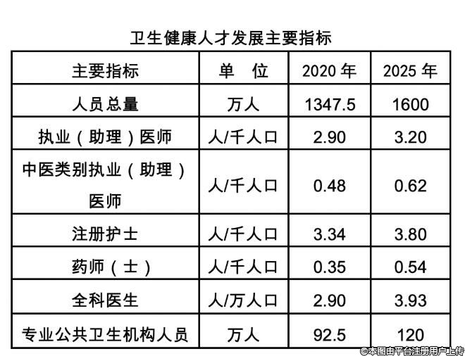 ——人才資源總量穩(wěn)步增長。到2025年,衛(wèi)生健康人員總量達到1600萬人,每千人口執(zhí)業(yè)(助理)醫(yī)師數(shù)達到3.20人(其中中醫(yī)類別0.62人)、每千人口注冊護士數(shù)達到3.80人、每千人口藥師(士)數(shù)達到0.54人,每萬人口全科醫(yī)生數(shù)達到3.93人,專業(yè)公共衛(wèi)生機構人員數(shù)增長到120萬人。