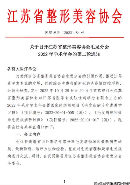 關(guān)于召開江蘇省整形美容協(xié)會毛發(fā)分會2022年學(xué)術(shù)年會的第二輪通知