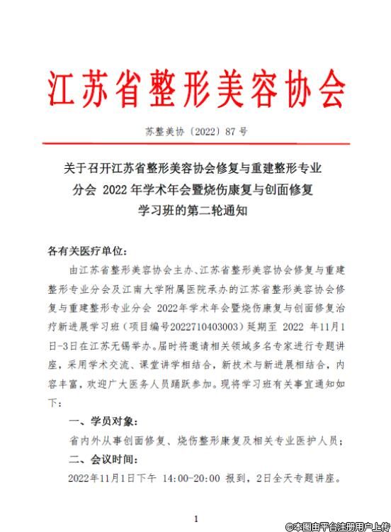 由江蘇省整形美容協(xié)會主辦、江蘇省整形美容協(xié)會修復(fù)與重建整形專業(yè)分會及江南大學(xué)附屬醫(yī)院承辦的江蘇省整形美容協(xié)會修復(fù)與重建整形專業(yè)分會2022年學(xué)術(shù)年會暨燒傷康復(fù)與創(chuàng)面修復(fù)治療新進(jìn)展學(xué)習(xí)班(項目編號2022710403003)延期至2022 年11月1日-3日在江蘇無錫舉辦。屆時將邀請相關(guān)領(lǐng)域多名專家進(jìn)行專題講座,采用學(xué)術(shù)交流、課堂講學(xué)相結(jié)合,新技術(shù)與新進(jìn)展相結(jié)合,內(nèi)容豐富,歡迎廣大醫(yī)務(wù)人員踴躍參加?,F(xiàn)將學(xué)習(xí)班有關(guān)事宜通知如下:
