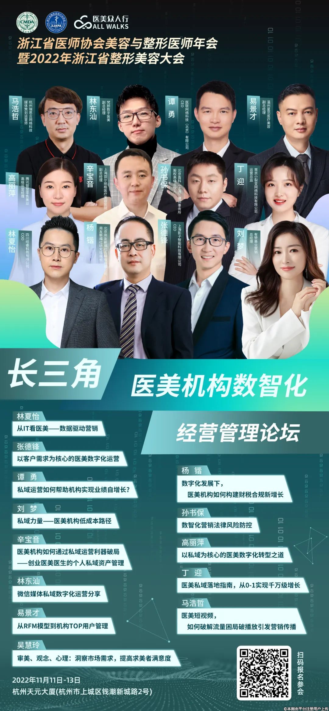 值此之際,本屆長三角醫(yī)美機構(gòu)數(shù)智化經(jīng)營管理論壇即將在杭州召開。本次論壇將于11月11-13日“浙江省醫(yī)師協(xié)會美容與整形醫(yī)師年會暨 2022 年浙江省整形美容大會”舉辦期間召開,旨在圍繞“醫(yī)美機構(gòu)數(shù)智化經(jīng)營管理”的新理念、新趨勢、新機遇,通過專家經(jīng)驗分享,創(chuàng)新思維交流,助力醫(yī)美企業(yè)構(gòu)建合理的數(shù)智化運營方案,提升企業(yè)的核心競爭力,為醫(yī)美行業(yè)在數(shù)字經(jīng)濟時代的升級發(fā)展貢獻力量。
