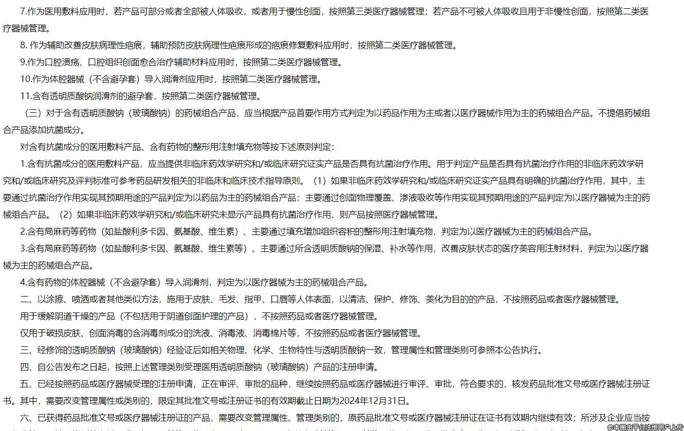 一、根據(jù)不同預期用途(適應癥)、工作原理等,醫(yī)用透明質(zhì)酸鈉(玻璃酸鈉)產(chǎn)品按照以下情形分別管理: