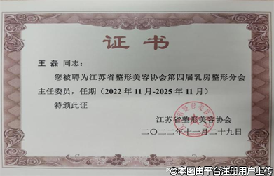 王磊主任擔(dān)任中華醫(yī)學(xué)會整形外科分會眼部美容學(xué)組、耳再造學(xué)組、兒童外科學(xué)組委員,中國人體健康科學(xué)促進(jìn)會乳房重建專業(yè)委員會常委、中國康復(fù)醫(yī)學(xué)會修復(fù)重建專業(yè)委員會美容學(xué)組常委,江蘇醫(yī)學(xué)會燒傷整形分會、醫(yī)學(xué)美學(xué)與美容分會常委,江蘇省整形美容協(xié)會副會長、常務(wù)理事,江蘇省整形美容協(xié)會乳房整形分會主任委員、江蘇省整形外科質(zhì)控中心副主任、南京市醫(yī)療美容質(zhì)控中心副主任、南京市醫(yī)學(xué)會醫(yī)學(xué)美學(xué)與美容分會副主任等多種社會職務(wù)。