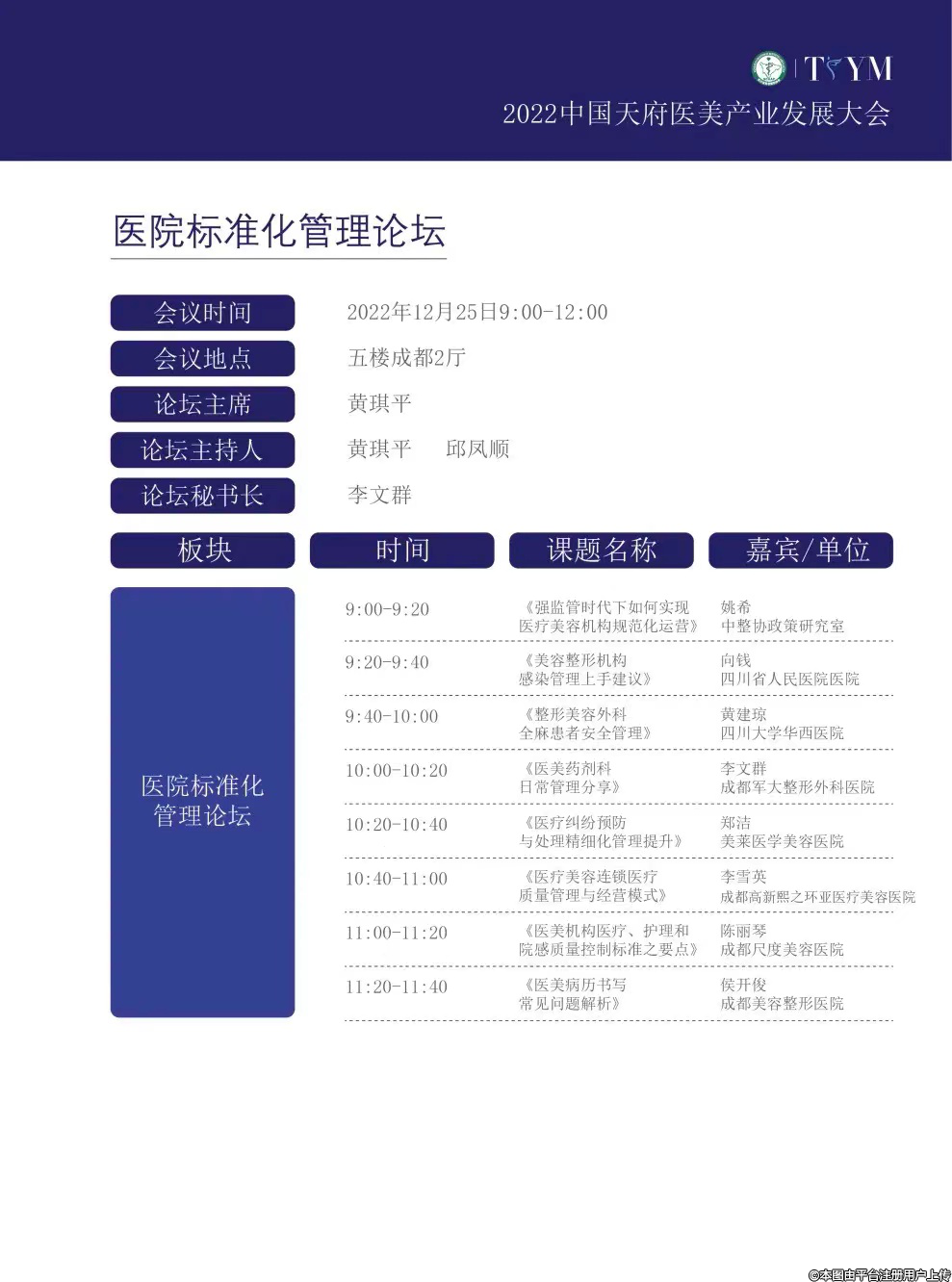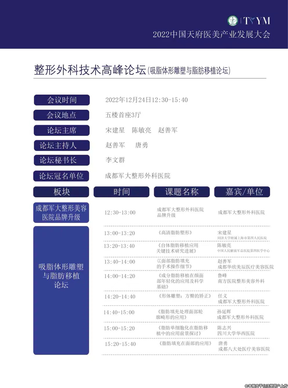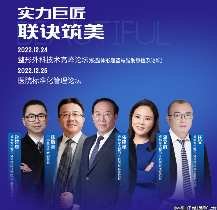 2022年12月23-25日,軍大整形將受邀參加由四川省美容整形協(xié)會和四川大學(xué)華西醫(yī)院聯(lián)盟主辦的「2022中國天府醫(yī)美產(chǎn)業(yè)發(fā)展大會暨華西醫(yī)美學(xué)術(shù)高峰論壇」,并承辦了大會“吸脂雕塑與脂肪移植論壇議”和“醫(yī)院標(biāo)準(zhǔn)化管理論壇”。