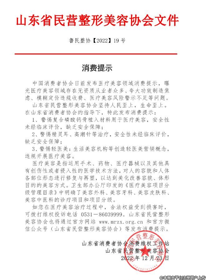 在山東省消費(fèi)者協(xié)會(huì)的指導(dǎo)下,山東省民營(yíng)整形美容協(xié)會(huì)發(fā)布了消費(fèi)提示: