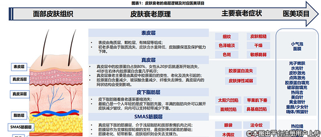 根據(jù)機構(gòu)真金白銀的態(tài)度,他們依次看好愛美客、華熙生物和貝泰妮、華東醫(yī)藥、昊海生科、魯商發(fā)展、朗姿股份、水羊股份。分析醫(yī)美行業(yè),我們先需要了解皮膚衰老的邏輯: