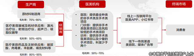 中游為醫(yī)美機構(gòu),主要包括公立醫(yī)院、大型連鎖醫(yī)院,中小型民營企業(yè)以及小型私人診所,平均毛利率50%,平均凈利率約10%。