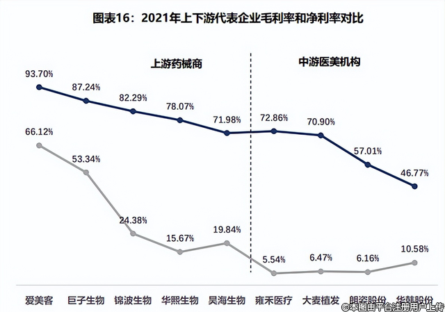 上游主要包括玻尿酸、肉毒素、膠原蛋白等原材料,以及各種醫(yī)療設(shè)備等器械,平均毛利率可達90%,平均凈利率可達30%,簡直是印鈔機,因此上游成為產(chǎn)業(yè)鏈中利潤最高的一環(huán)。