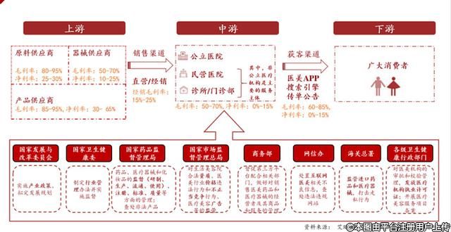 醫(yī)美產(chǎn)業(yè)鏈,呈現(xiàn)微曲線,且上游產(chǎn)業(yè)鏈值得關(guān)注: