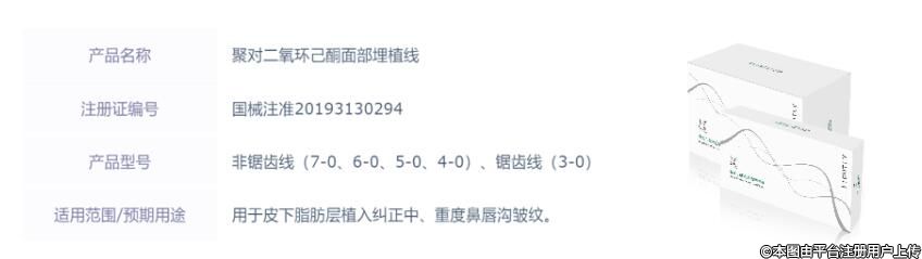 值得一提的,愛美客的“聚對二氧環(huán)己酮面部埋植線(商品名:TIGHTLY緊戀)”已于2019年5月獲得NMPA批準(zhǔn),成為國內(nèi)首張獲批上市的,用于皮下脂肪層植入糾正中、重度鼻唇溝皺紋的安全醫(yī)美材料。“TIGHTLY緊戀”是由聚對二氧環(huán)己酮制成的可吸收單股線,經(jīng)切割而成,染紫色,裝置于導(dǎo)入針當(dāng)中,并采用固定模塊將外露線頭固定。其中3-0規(guī)格為鋸齒線,4-0以下規(guī)格為非鋸齒線,鋸齒線的鋸齒由刀具切割而成,均朝向同一方向。導(dǎo)入針座裝有手柄模塊。