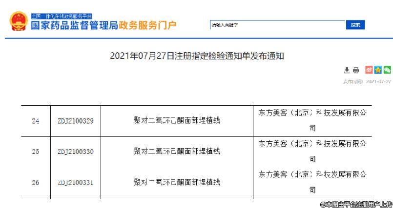 據(jù)悉,東方美客系由(以下簡稱“愛美客”,股票代碼:300896)與韓國DongBang Medical co.,Ltd(株式會社東方醫(yī)療)合資成立。其中,愛美客持有該公司51%股份。東方美客通過引進韓國專利技術(shù),進行埋植線產(chǎn)品的研發(fā)和生產(chǎn),將進一步提升其在埋植線產(chǎn)品方向的長期領(lǐng)先和競爭能力。(推薦閱讀:喜訊 | Dong Bang Medical“注射用交聯(lián)透明質(zhì)酸鈉凝膠”獲NMPA批準(zhǔn)上市!)公開資料獲悉,2021年7月,東方美客正式啟動3款“聚對二氧環(huán)己酮面部埋植線”注冊申報工作。