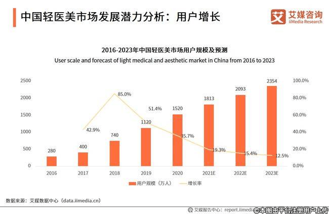 艾媒咨詢《2021年中國輕醫(yī)美行業(yè)研究及產(chǎn)業(yè)鏈分析報告》數(shù)據(jù)顯示,2020年中國非手術(shù)類醫(yī)美市場規(guī)模為545億元,預(yù)計2021年市場規(guī)模將增至798億元,在未來幾年中輕醫(yī)美占比不斷增大;2020年輕醫(yī)美用戶規(guī)模達1520萬,預(yù)計到2021年將達到1813萬。艾媒咨詢分析師認為,輕醫(yī)美因其創(chuàng)傷小、風(fēng)險低、單價低等優(yōu)勢,對比手術(shù)類醫(yī)美將具有更高的市場接受度和復(fù)購率,用戶規(guī)模的持續(xù)增長,表明中國輕醫(yī)美市場呈現(xiàn)快速發(fā)展趨勢,將會成為未來推動醫(yī)美行業(yè)增長的主要動力。