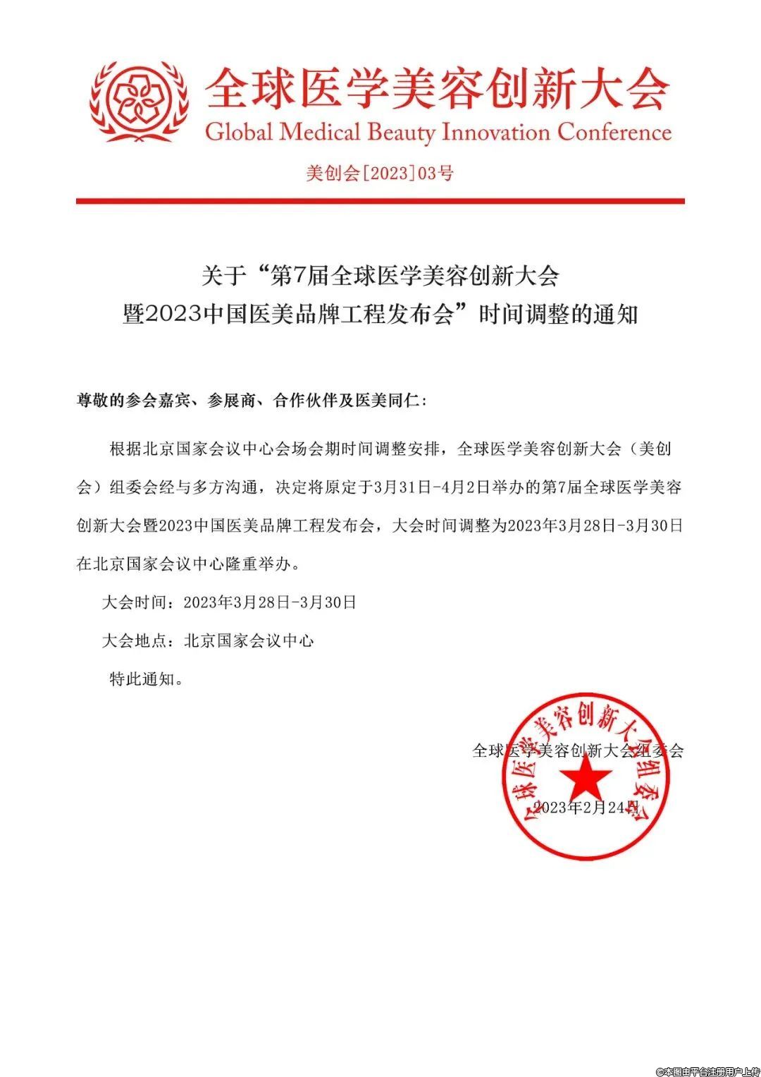 第七屆全球醫(yī)學美容創(chuàng)新大會暨2023中國醫(yī)美品牌工程發(fā)布會時間做了調(diào)整