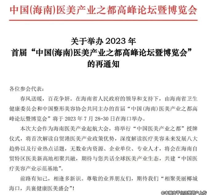 為進(jìn)一步貫徹推進(jìn)建設(shè)健康中國的國家戰(zhàn)略部署,由中國整形美容協(xié)會(huì)和海南省衛(wèi)生健康委員會(huì)共同主辦的首屆“中國(海南)醫(yī)美產(chǎn)業(yè)之都高峰論壇暨博覽會(huì)”將于2023年7月28-30日在海口國際會(huì)議展覽中心舉辦。本次大會(huì)醫(yī)美產(chǎn)業(yè)最新發(fā)展趨勢(shì)和行業(yè)熱點(diǎn)話題、醫(yī)療美容行業(yè)的標(biāo)準(zhǔn)化與規(guī)范化、中國醫(yī)美的特色與面臨的大變局以及醫(yī)美產(chǎn)業(yè)政策與行業(yè)監(jiān)管等主題展開分論壇交流。