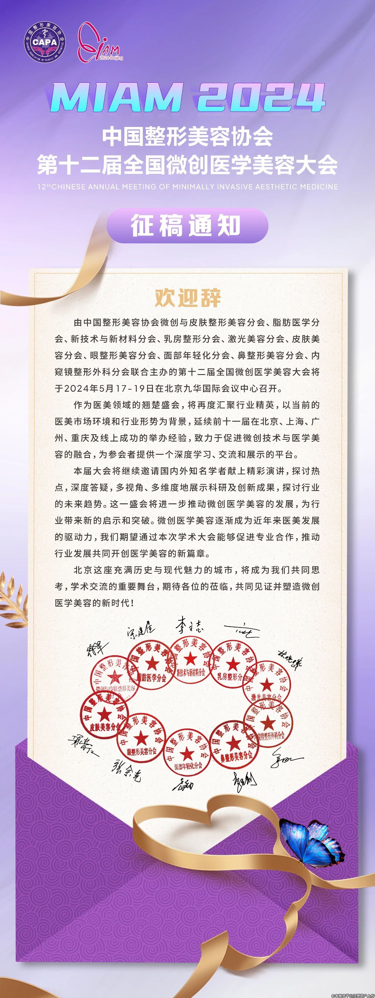 由中國(guó)整形美容協(xié)會(huì)微創(chuàng)與皮膚整形美容分會(huì)、脂肪醫(yī)學(xué)分會(huì)、新技術(shù)與新材料分會(huì)、乳房整形分會(huì)、激光美容分會(huì)、皮膚美容分會(huì)、眼整形美容分會(huì)、面部年輕化分會(huì)、鼻整形美容分會(huì)、內(nèi)窺鏡整形外科分會(huì)聯(lián)合主辦的第十二屆全國(guó)微創(chuàng)醫(yī)學(xué)美容大會(huì)將于2024年5月17-19日在北京九華國(guó)際會(huì)議中心召開。