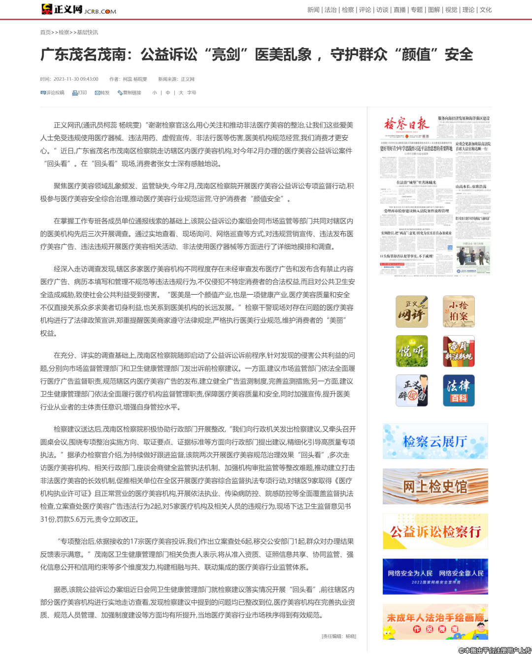 11月30日,正義網(wǎng)以《廣東茂名茂南:公益訴訟“亮劍”醫(yī)美亂象 ,守護(hù)群眾“顏值”安全》為題,報(bào)道了茂南區(qū)人民檢察院“開(kāi)展醫(yī)療美容公益訴訟專(zhuān)項(xiàng)監(jiān)督行動(dòng)”工作做法。原文如下: