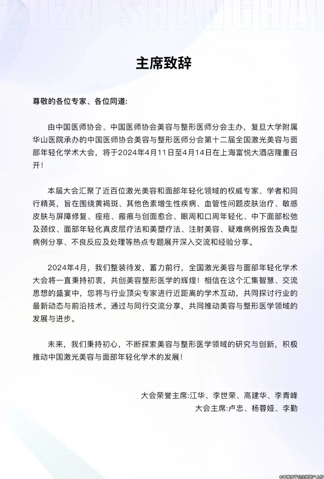 會(huì)議無(wú)論是規(guī)模、學(xué)術(shù)領(lǐng)域還是行業(yè)展示都將再次突破以往,帶給與會(huì)者們席卷心靈的震撼!我們力求打破傳統(tǒng),讓每一個(gè)與會(huì)者都能不虛此行、超越期待!2024年4月11日,讓我們共同續(xù)寫(xiě)新輝煌,書(shū)寫(xiě)屬于激光美容和面部年輕化領(lǐng)域的新篇章!