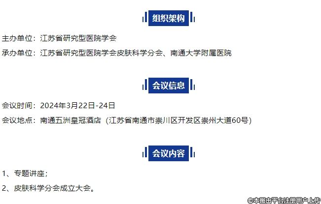 為全面提升江蘇省各級(jí)醫(yī)院皮膚科學(xué)專業(yè)醫(yī)療技術(shù)水平和服務(wù)質(zhì)量,健全江蘇省皮膚科醫(yī)師隊(duì)伍的建設(shè)和管理追蹤皮膚科學(xué)領(lǐng)域新進(jìn)展,擬于2024年3月22日-24日在南通五洲皇冠酒店召開(kāi)“皮膚科學(xué)分會(huì)第一屆年會(huì)暨皮膚科學(xué)分會(huì)成立大會(huì)”。本次會(huì)議將邀請(qǐng)全國(guó)皮膚科學(xué)領(lǐng)域的著名專家授課并召開(kāi)皮膚科學(xué)分會(huì)成立大會(huì)參會(huì)人員200人。歡迎皮膚科醫(yī)師參會(huì)。