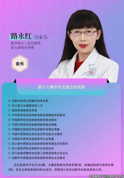本期大會主席由成都市第二人民醫(yī)院路永紅教授和德陽市皮膚病研究所所長鄔建川共同擔任。