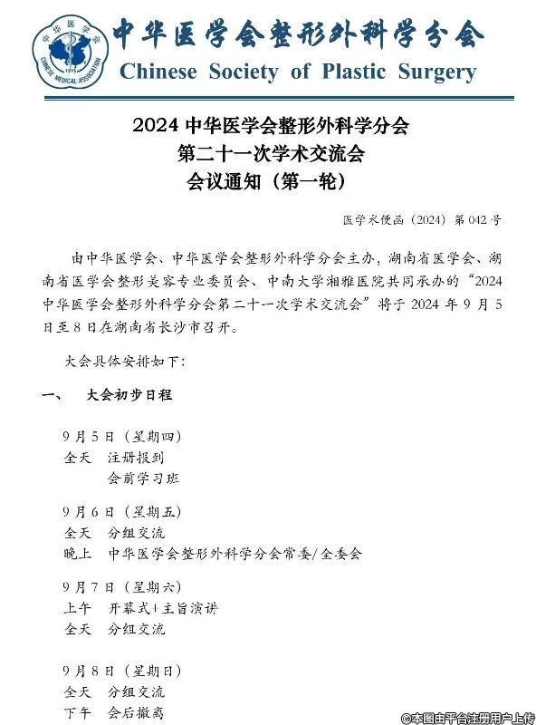 由中華醫(yī)學(xué)會(huì)、中華醫(yī)學(xué)會(huì)整形外科學(xué)分會(huì)主辦,湖南省醫(yī)學(xué)會(huì)、湖南省醫(yī)學(xué)會(huì)整形美容專業(yè)委員會(huì)、中南大學(xué)湘雅醫(yī)院共同承辦的“2024中華醫(yī)學(xué)會(huì)整形外科學(xué)分會(huì)第二十一次學(xué)術(shù)交流會(huì)”將于2024年9月5日至8日在湖南省長(zhǎng)沙市召開。