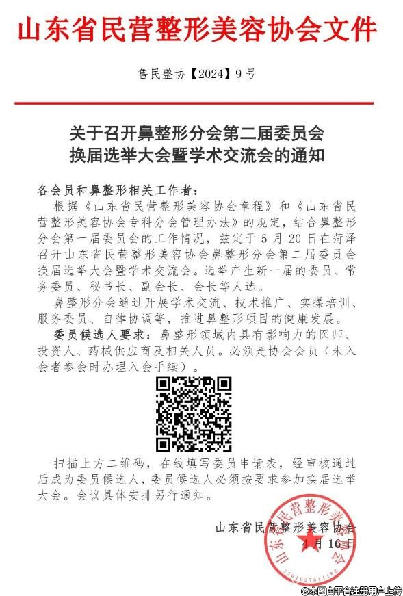 鼻整形分會通過開展學(xué)術(shù)交流、技術(shù)推廣、實(shí)操培訓(xùn)、服務(wù)委員、自律協(xié)調(diào)等,推進(jìn)鼻整形項(xiàng)目的健康發(fā)展。委員候選人要求:鼻整形領(lǐng)域內(nèi)具有影響力的醫(yī)師、投資人、藥械供應(yīng)商及相關(guān)人員。必須是協(xié)會會員(未入會者參會時辦理入會手續(xù))。掃描下方二維碼,在線填寫委員申請表,經(jīng)審核通過后成為委員候選人,委員候選人必須按要求參加換屆選舉大會。