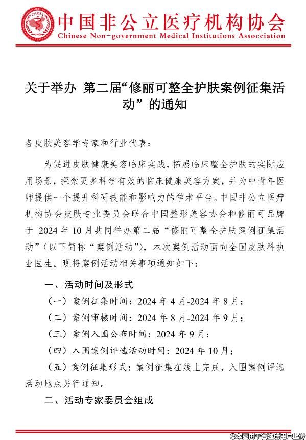 為促進皮膚健康美容臨床實踐,拓展臨床整全護膚的實際應用場景,探索更多科學有效的臨床健康美容方案,并為中青年醫(yī)師提供一個提升科研技能和影響力的學術平臺。中國非公立醫(yī)療機構協(xié)會皮膚專業(yè)委員會聯(lián)合中國整形美容協(xié)會和修麗可品牌于 2024年10月共同舉辦第二屆“修麗可整全護膚案例征集活動”(以下簡稱“案例活動”),本次案例活動面向全國皮膚科執(zhí)業(yè)醫(yī)生?,F(xiàn)將案例活動相關事項通知如下: