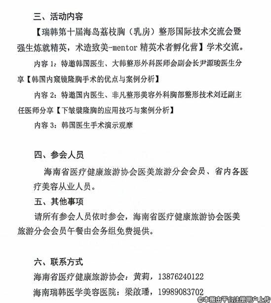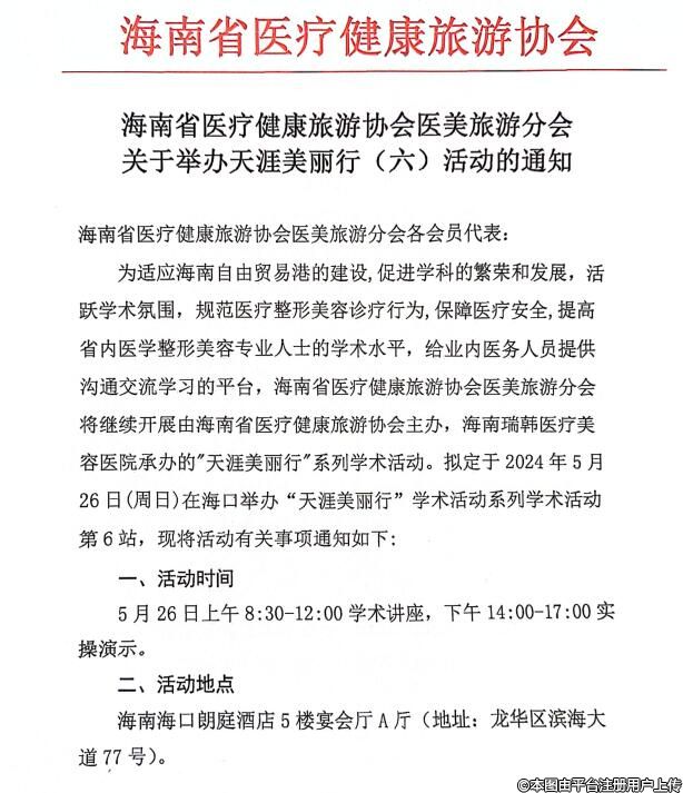 為適應(yīng)海南自由貿(mào)易港的建設(shè),促進(jìn)學(xué)科的繁榮和發(fā)展,活躍學(xué)術(shù)氛圍,規(guī)范醫(yī)療整形美容診療行為,保障醫(yī)療安全,提高省內(nèi)醫(yī)學(xué)整形美容專(zhuān)業(yè)人士的學(xué)術(shù)水平,給業(yè)內(nèi)醫(yī)務(wù)人員提供溝通交流學(xué)習(xí)的平臺(tái),海南省醫(yī)療健康旅游協(xié)會(huì)醫(yī)美旅游分會(huì)將繼續(xù)開(kāi)展由海南省醫(yī)療健康旅游協(xié)會(huì)主辦,海南瑞韓醫(yī)療美容醫(yī)院承辦的"天涯美麗行"系列學(xué)術(shù)活動(dòng)。擬定于2024年5月26日(周日)在海口舉辦“天涯美麗行”學(xué)術(shù)活動(dòng)系列學(xué)術(shù)活動(dòng)第6站。