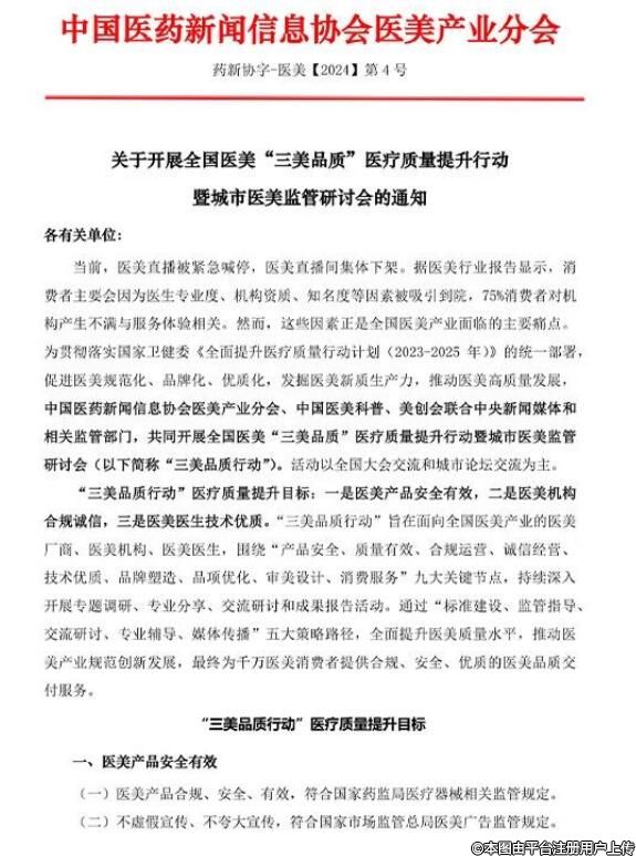 當(dāng)前,醫(yī)美直播被緊急喊停,醫(yī)美直播間集體下架。據(jù)醫(yī)美行業(yè)報(bào)告顯示,消費(fèi)者主要會因?yàn)獒t(yī)生專業(yè)度、機(jī)構(gòu)資質(zhì)、知名度等因素被吸引到院,75%消費(fèi)者對機(jī)構(gòu)產(chǎn)生不滿與服務(wù)體驗(yàn)相關(guān)。然而,這些因素正是全國醫(yī)美產(chǎn)業(yè)面臨的主要痛點(diǎn)。為貫徹落實(shí)國家衛(wèi)健委《全面提升醫(yī)療質(zhì)量行動計(jì)劃(2023-2025年)》的統(tǒng)一部署,促進(jìn)醫(yī)美規(guī)范化、品牌化、優(yōu)質(zhì)化,發(fā)掘醫(yī)美新質(zhì)生產(chǎn)力,推動醫(yī)美高質(zhì)量發(fā)展,中國醫(yī)藥新聞信息協(xié)會醫(yī)美產(chǎn)業(yè)分會、中國醫(yī)美科普、美創(chuàng)會聯(lián)合中央新聞媒體和相關(guān)監(jiān)管部門,共同開展全國醫(yī)美“三美品質(zhì)醫(yī)療質(zhì)量提升行動暨城市醫(yī)美監(jiān)管研討會(以下簡稱“三美品質(zhì)行動”)。