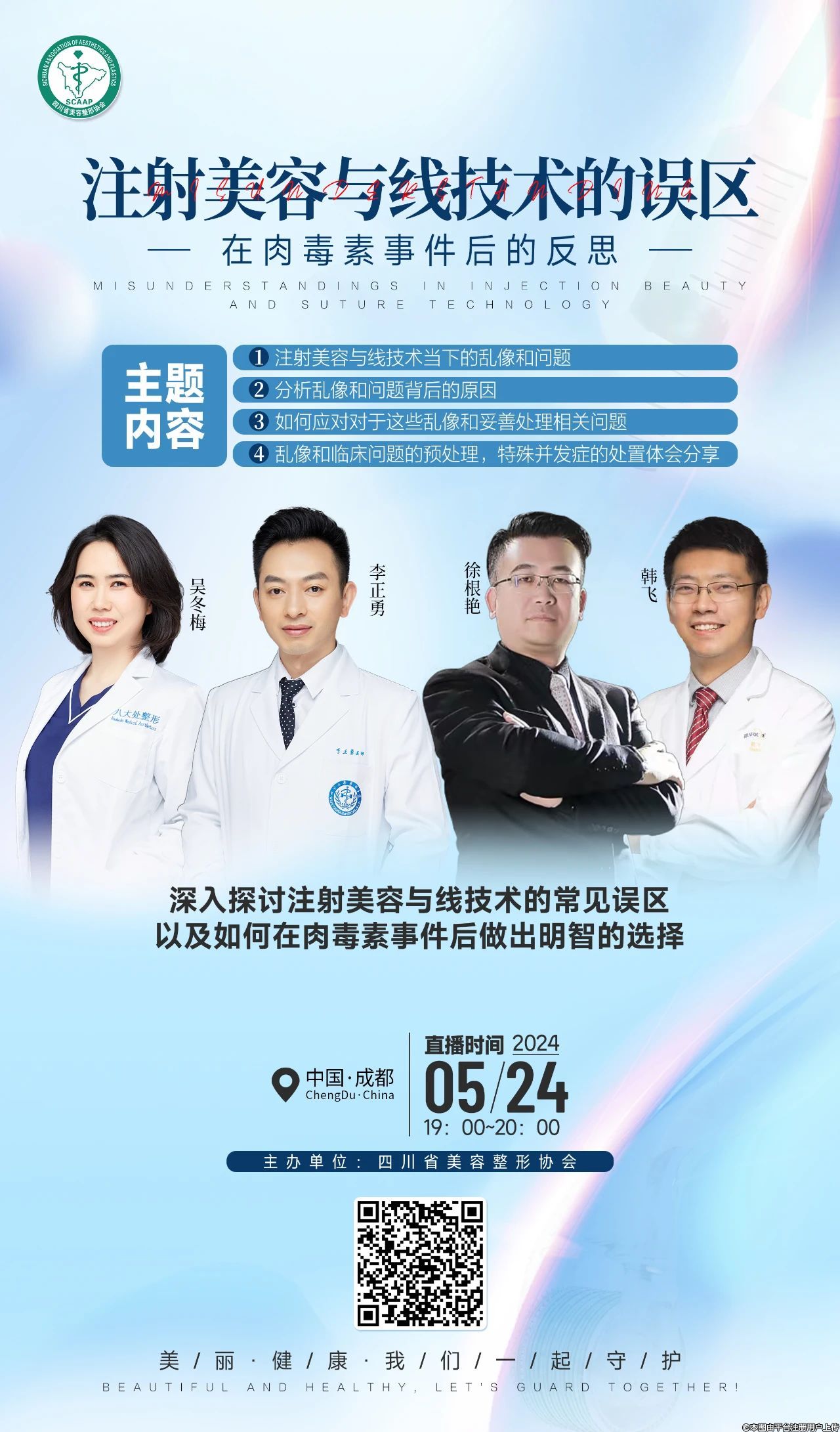 5月24日,四川省美容整形協(xié)會、四川省美容整形協(xié)會面部整形與修復(fù)再生分會舉辦主題為“注射美容與線技術(shù)的誤區(qū)”線上交流會,將和大家一起探討注射美容與線技術(shù)的常見誤區(qū),以及如何在肉毒素事件后需要做出的選擇。
