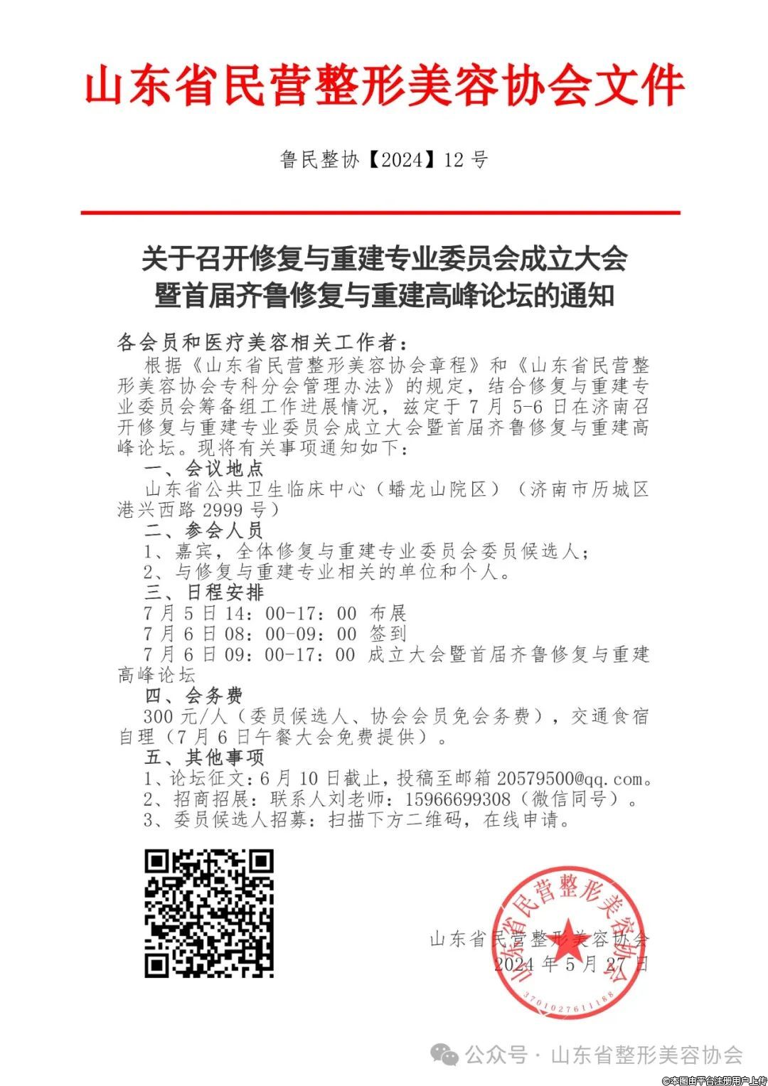 根據(jù)《山東省民營整形美容協(xié)會章程》和《山東省民營整形美容協(xié)會??品謺芾磙k法》的規(guī)定,結(jié)合修復(fù)與重建專業(yè)委員會籌備組工作進(jìn)展情況,茲定于7月5-6日在濟(jì)南召開修復(fù)與重建專業(yè)委員會成立大會暨首屆齊魯修復(fù)與重建高峰論壇?,F(xiàn)將有關(guān)事項通知如下: