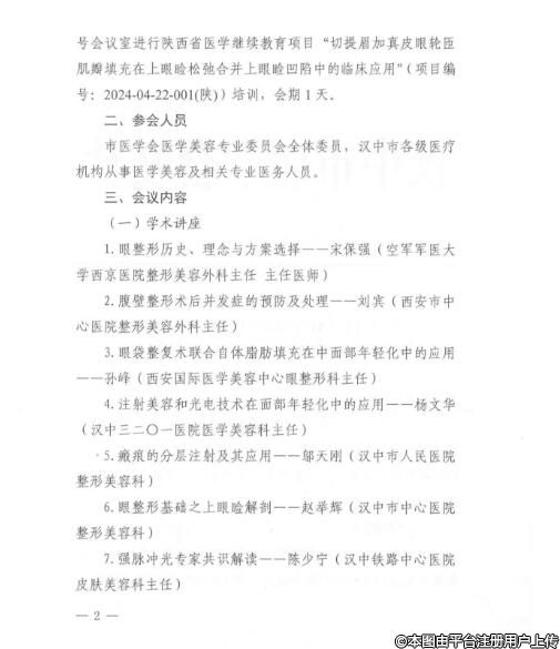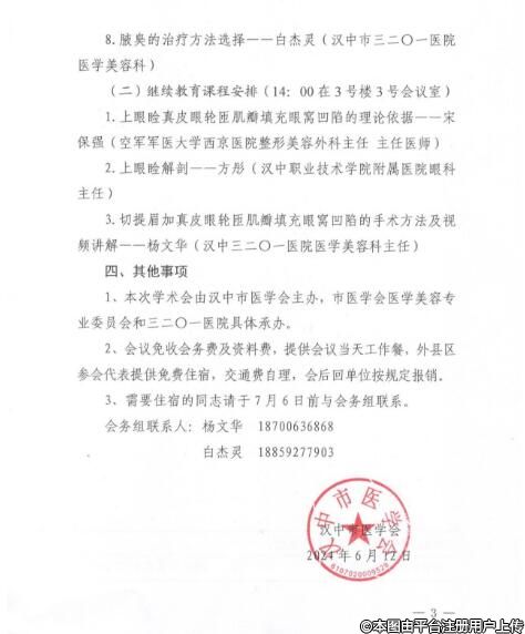 為進一步提升我市各醫(yī)療機構醫(yī)學美容技術水平,促進醫(yī)學美容專業(yè)學術交流,決定召開漢中市醫(yī)學美容專業(yè)學術會議,同時進行陜西省醫(yī)學繼續(xù)教育項目授課培訓?,F(xiàn)將有關事項通知如下: