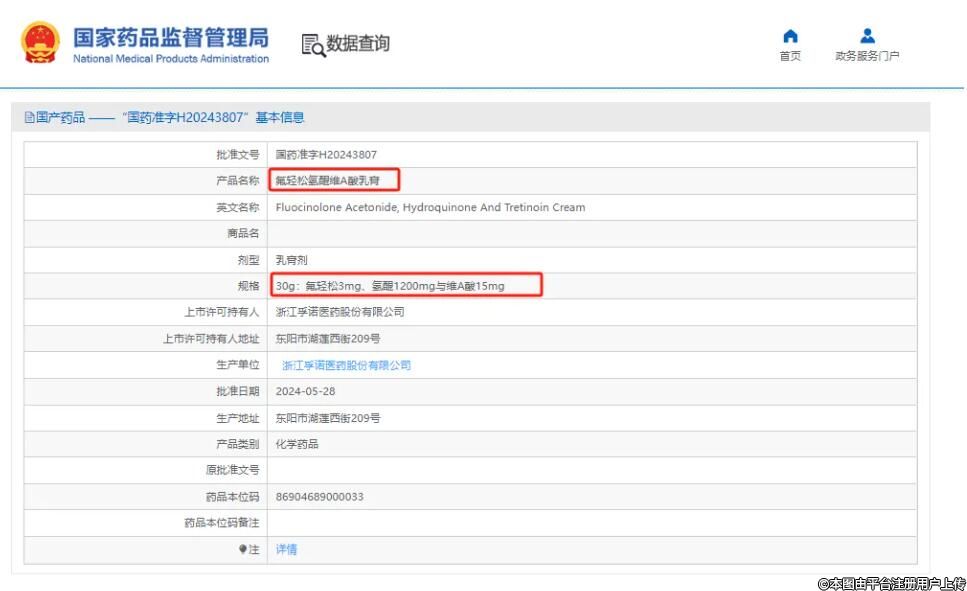 2024年5月28日,浙江孚諾醫(yī)藥股份有限公司旗下的孚美達(dá)®“氟輕松氫醌維A酸乳膏”正式獲國(guó)家藥監(jiān)局批準(zhǔn)上市,批準(zhǔn)文號(hào):國(guó)藥準(zhǔn)字H20243807,成為國(guó)內(nèi)首個(gè)國(guó)產(chǎn)氟輕松氫醌維A酸乳膏。