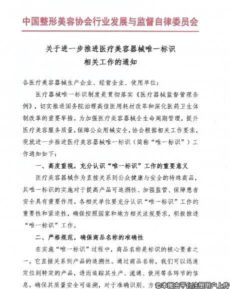 醫(yī)療器械唯一標(biāo)識制度是貫徹落實(shí)《醫(yī)療器械監(jiān)督管理?xiàng)l例》,切實(shí)推進(jìn)國務(wù)院治理高值醫(yī)用耗材改革和深化醫(yī)藥衛(wèi)生體制改革的重要舉措。為加強(qiáng)醫(yī)療美容器械全生命周期管理,提升醫(yī)療美容服務(wù)質(zhì)量,保障公眾用械安全,協(xié)會根據(jù)相關(guān)工作要求,現(xiàn)就進(jìn)一步推進(jìn)醫(yī)療美容器械唯一標(biāo)識(簡稱“唯一標(biāo)識”)工作通知如下: