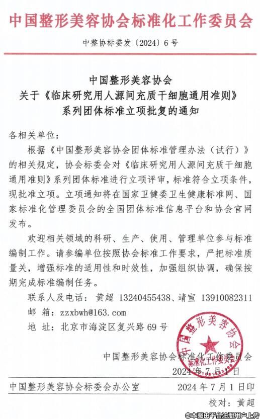 中國整形美容協(xié)會關于《臨床研究用人源間充質干細胞通用準則》系列團體標準立項批復的通知