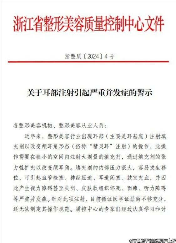 近期,我們注意到整形美容行業(yè)中出現(xiàn)了一種新的操作趨勢,即通過在耳部(尤其是耳基底區(qū)域)注射填充劑來改變顱耳角的形態(tài),俗稱“精靈耳”注射。雖然這一操作旨在滿足部分消費(fèi)者對于特定耳部形態(tài)的追求,但其潛在的風(fēng)險和并發(fā)癥不容忽視。請各位醫(yī)療美容從業(yè)人員務(wù)必高度重視以下文件浙整質(zhì)[2024]4號,切實(shí)履行好自身的職責(zé)和義務(wù),保障患者的安全和健康。