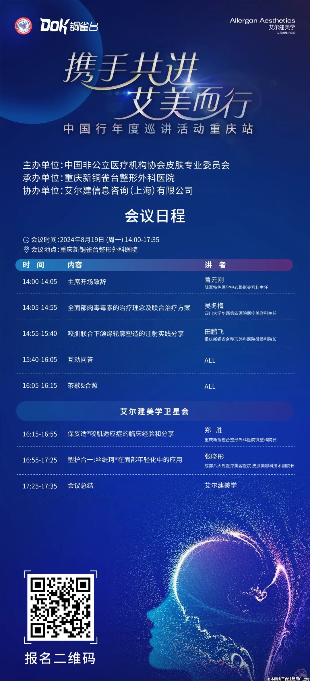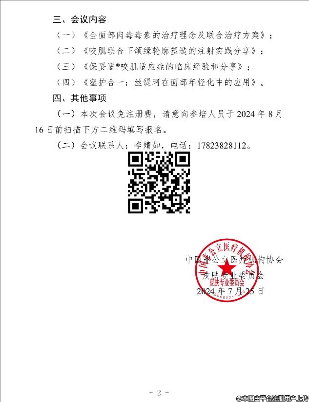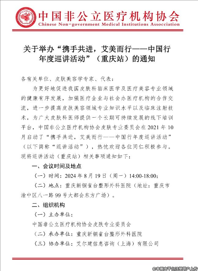 為更好地促進我國皮膚科臨床醫(yī)學及醫(yī)療美容專業(yè)領域的健康有序發(fā)展,加強醫(yī)療企業(yè)與社會辦醫(yī)療機構的合作交流,進一步提高皮膚美容領域?qū)I(yè)知識水平以及臨床注射技術,為廣大皮膚科醫(yī)師提供一個長期可持續(xù)發(fā)展的線下培訓平臺,中國非公立醫(yī)療機構協(xié)會皮膚專業(yè)委員會在2021年10月啟動了“攜手共進,艾美而行——中國行年度巡講活動”(以下簡稱“巡講活動”),熱忱歡迎各位同仁積極參與?,F(xiàn)將巡講活動(重慶站)相關事項通知如下: