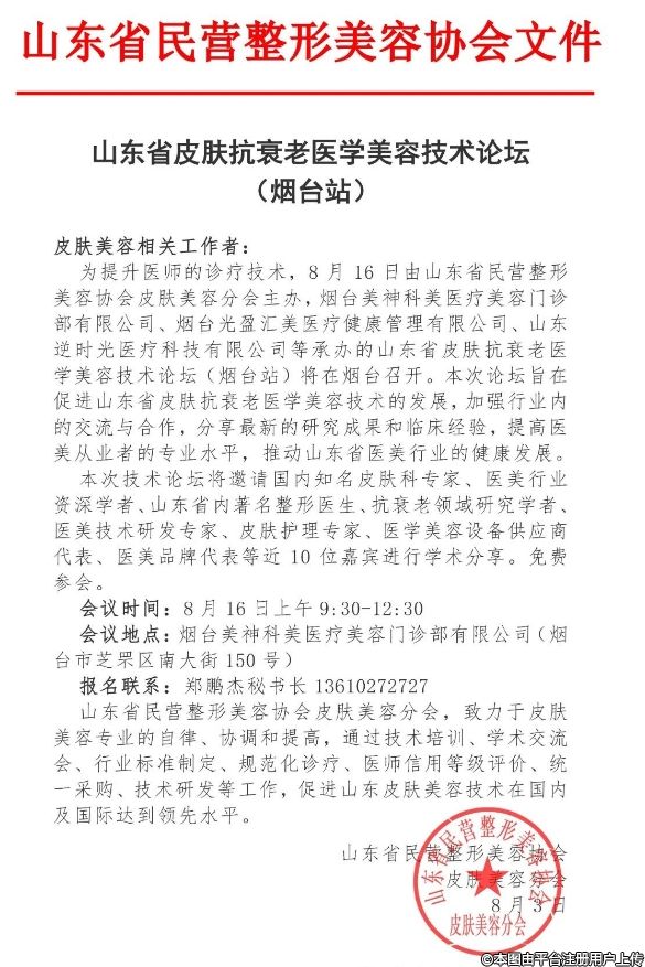 為提升醫(yī)師的診療技術,8月16日由山東省民營整形美容協(xié)會皮膚美容分會主辦,煙臺美神科美醫(yī)療美容門診部有限公司、煙臺光盈匯美醫(yī)療健康管理有限公司、山東逆時光醫(yī)療科技有限公司等承辦的山東省皮膚抗衰老醫(yī)學美容技術論壇(煙臺站)將在煙臺召開。本次論壇旨在促進山東省皮膚抗衰老醫(yī)學美容技術的發(fā)展,加強行業(yè)內(nèi)的交流與合作,分享最新的研究成果和臨床經(jīng)驗,提高醫(yī)美從業(yè)者的專業(yè)水平,推動山東省醫(yī)美行業(yè)的健康發(fā)展。