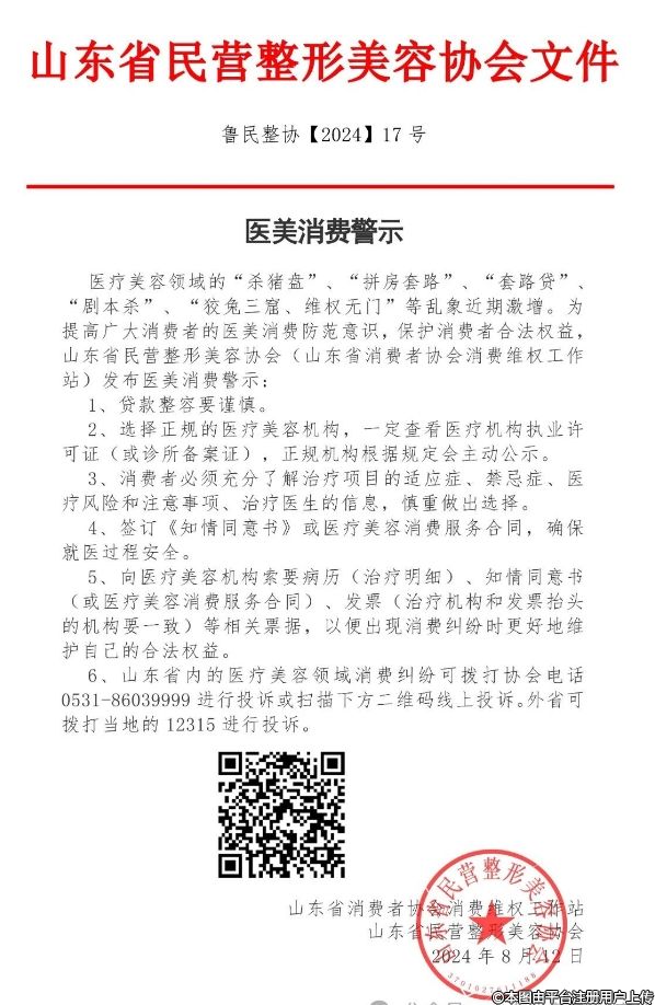 醫(yī)療美容領(lǐng)域的“殺豬盤”、“拼房套路”“套路貸“劇本殺”“狡兔三窟、維權(quán)無門”等亂象近期激增。為提高廣大消費(fèi)者的醫(yī)美消費(fèi)防范意識(shí),保護(hù)消費(fèi)者合法權(quán)益,山東省民營整形美容協(xié)會(huì)(山東省消費(fèi)者協(xié)會(huì)消費(fèi)維權(quán)工作站)發(fā)布醫(yī)美消費(fèi)警示:
